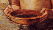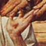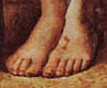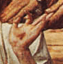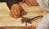 This the hand, and feet of Christ, and these cuts, perhaps some how the fault of the rather guilty looking John, foreshadow the stigmata, the wounds from the Crucifixion. The position in which he holds his hand also resembles the way He is typically depicted as holding them when blessing, thus foreshadowing his role as a religious leader.