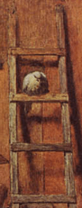 Here we see two different symbols. The first is the ladder, which refers to Jacob’s Ladder, and is often seen in the background of religious works, such as in engravings by Durer. The second is the dove, which traditionally symbolises the Holy Spirit (The Oxford Movement believed in the Trinity). Even its position is traditional, as it sits almost central, and slightly above the other figures, thus looking down on them and watching over them.
